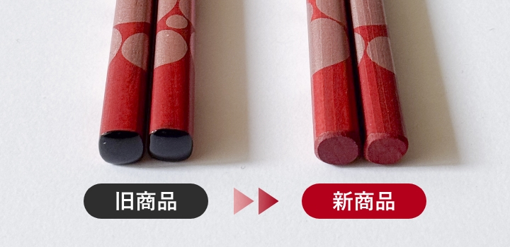 製造・販売の再開に向けての製造環境立て直しの中で、箸頭の改良にも取り組み、素地を削って継ぎ目を無くした形状にしました。本体と一体のため頭が外れる心配がなく、また、デザインに応じたたカラー展開となっています。